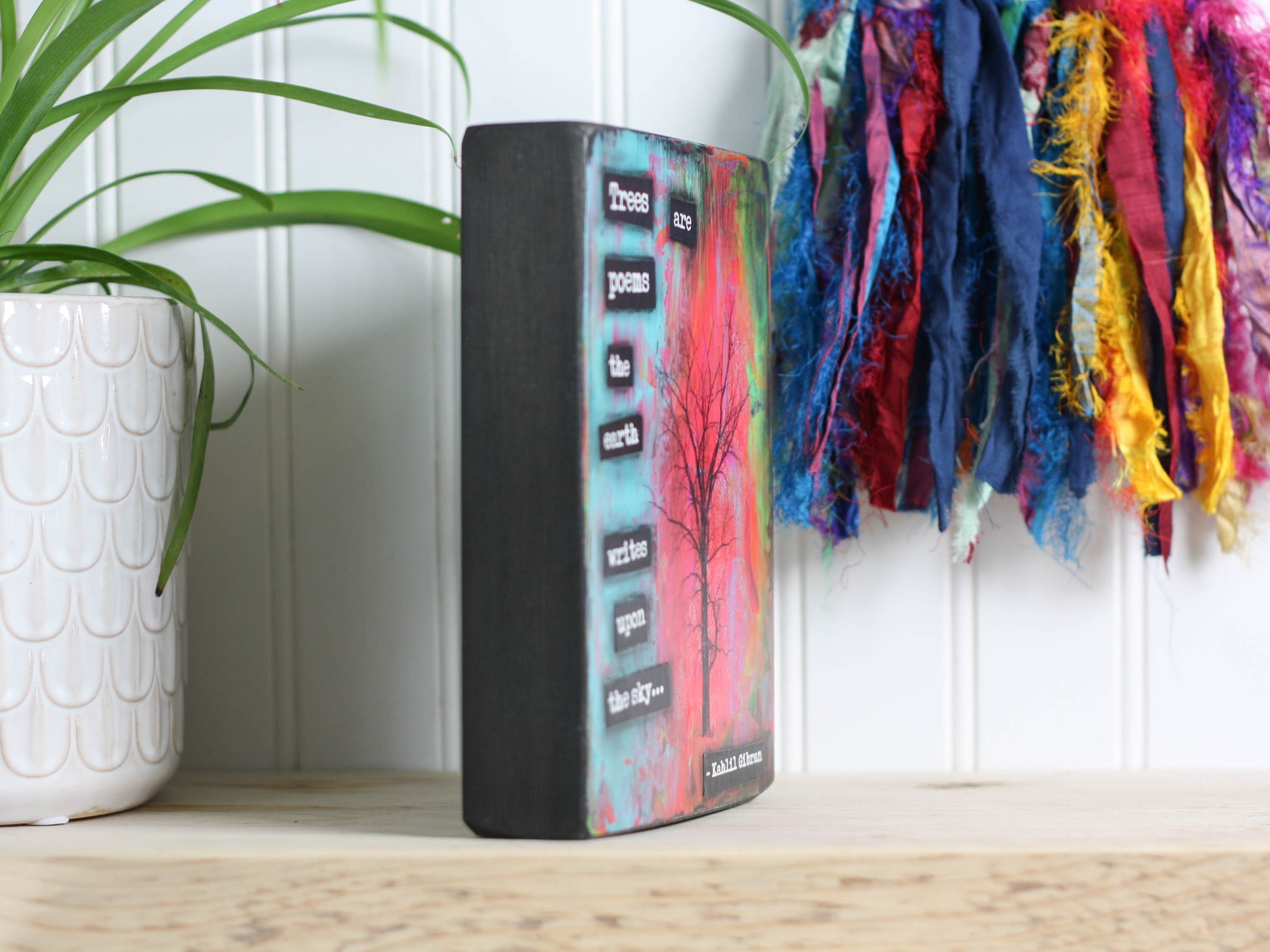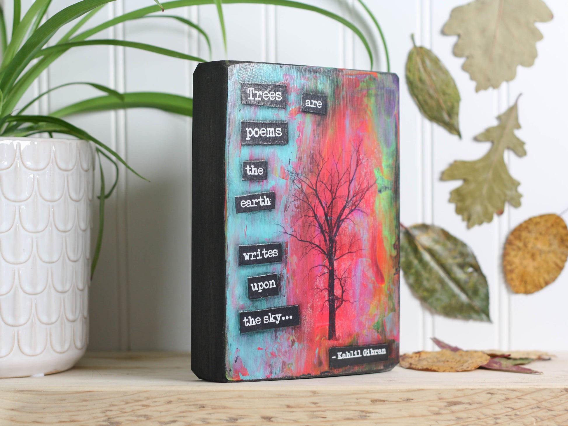 This 5.5"x7" freestanding original mixed media artwork is a unique one of a kind piece, painted onto a piece of upcycled wood. Art blocks are a fun way to add a touch of colour to your home or office decor. The back and edges have been stained ebony (black).