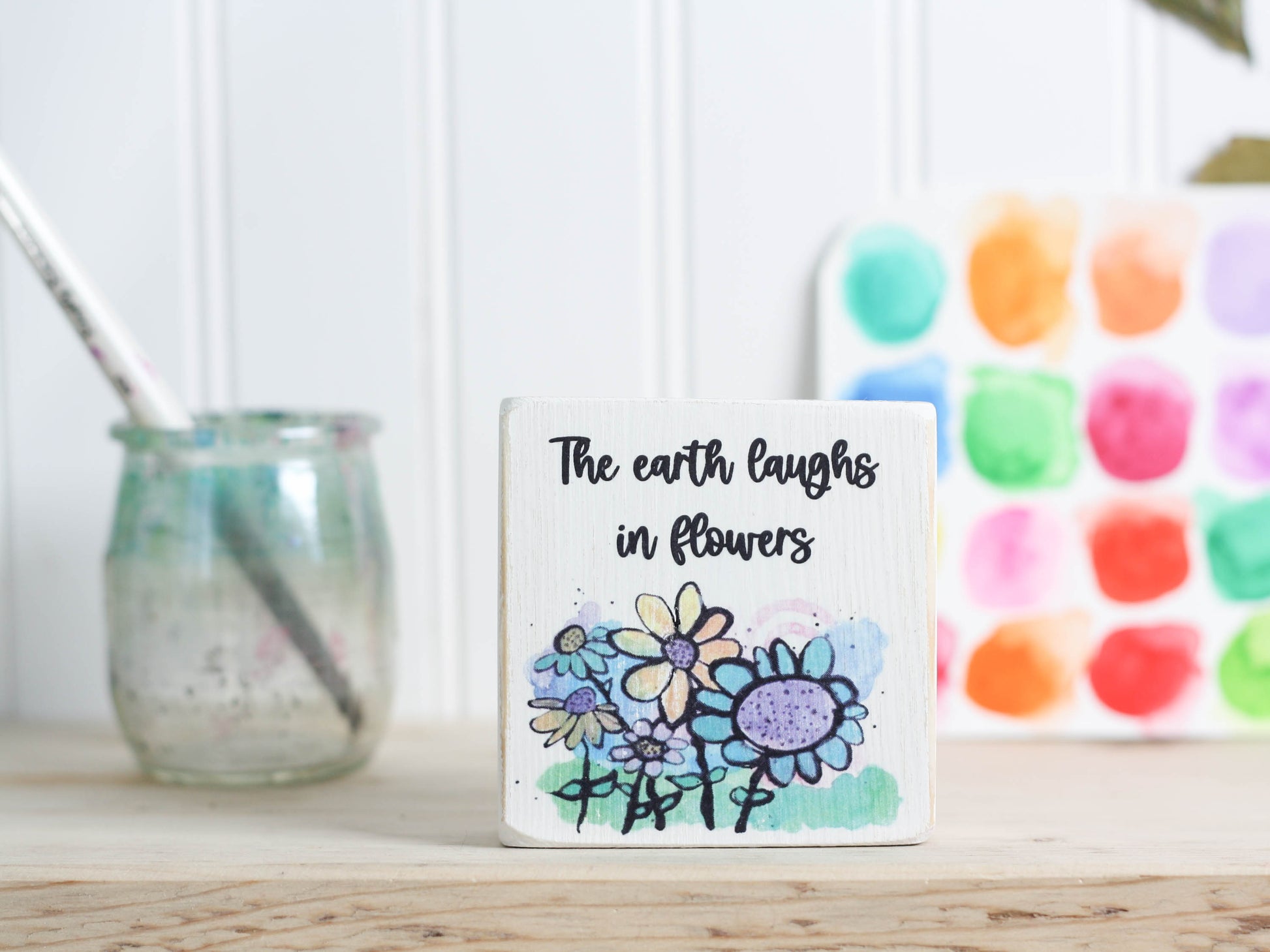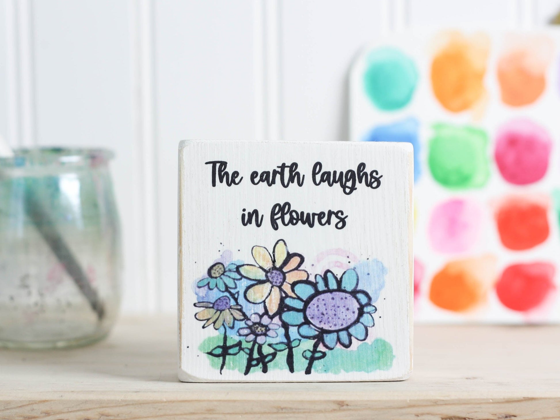 Small Wooden Sign - Flower art "the earth laughs in flowers"