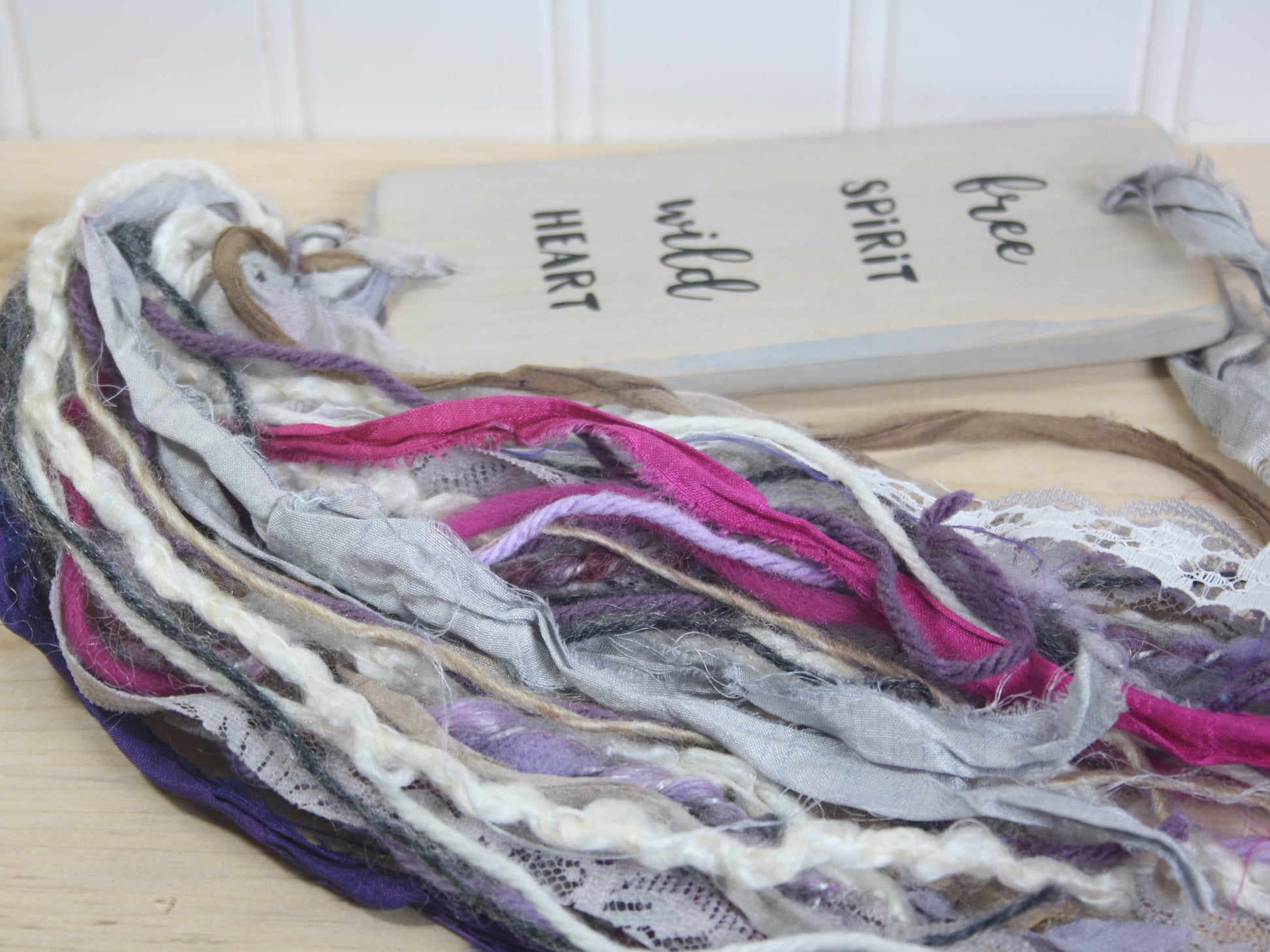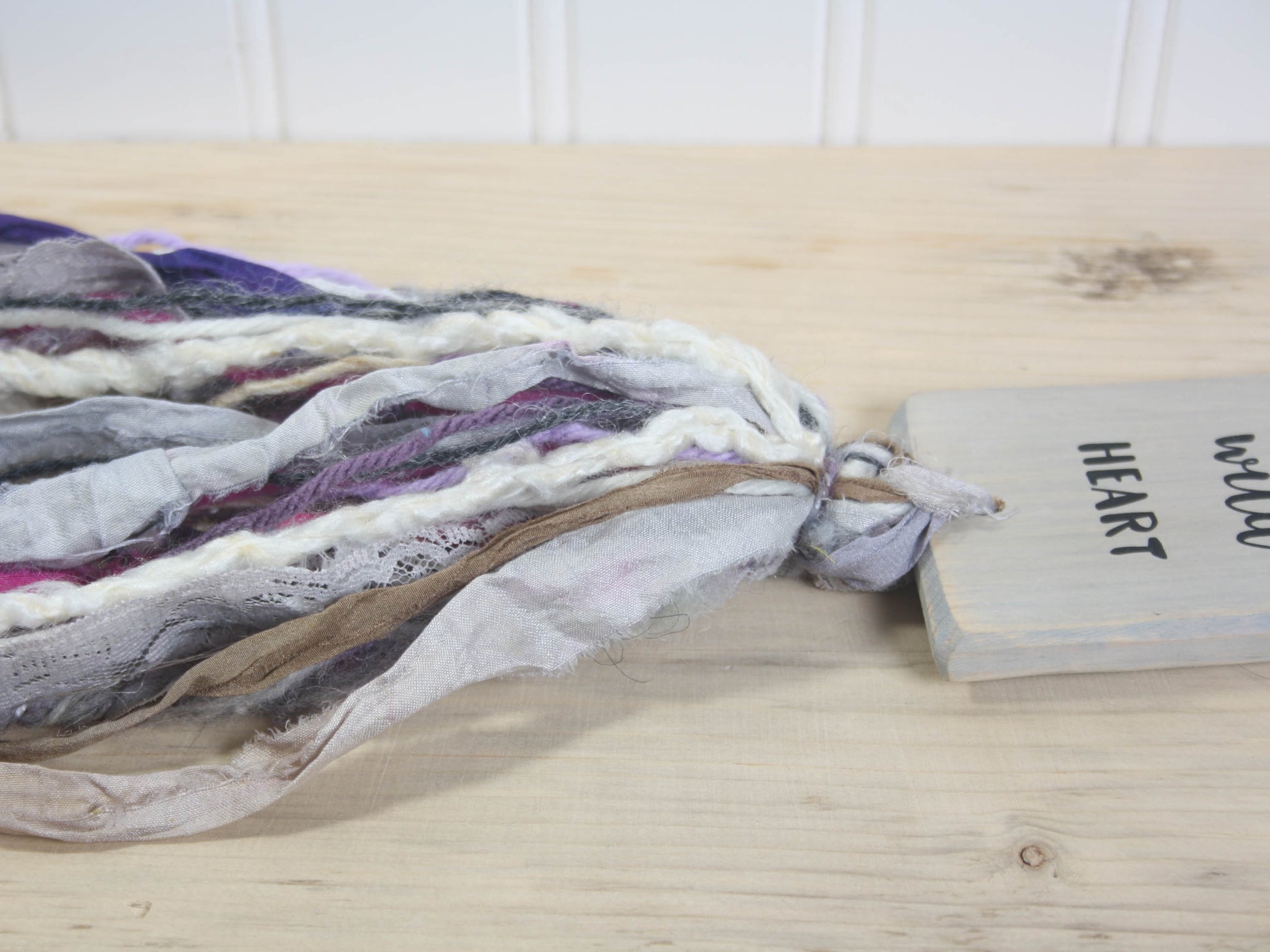 The wood is cut sanded, and stained in our workshop, and the tassel is made from upcycled materials, and can include yarn, lace, upcycled sari strip remnants, or even some fabric strips.